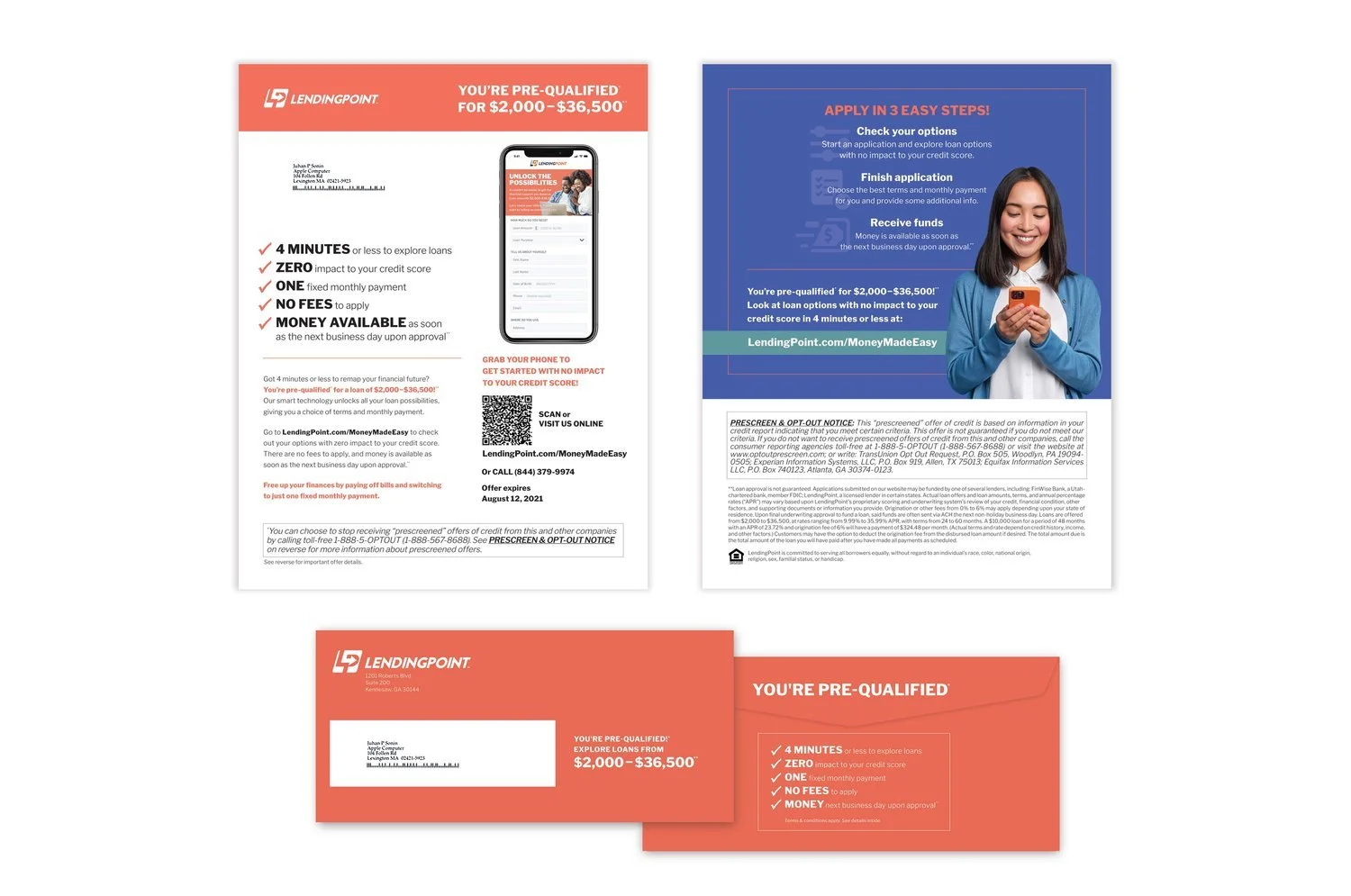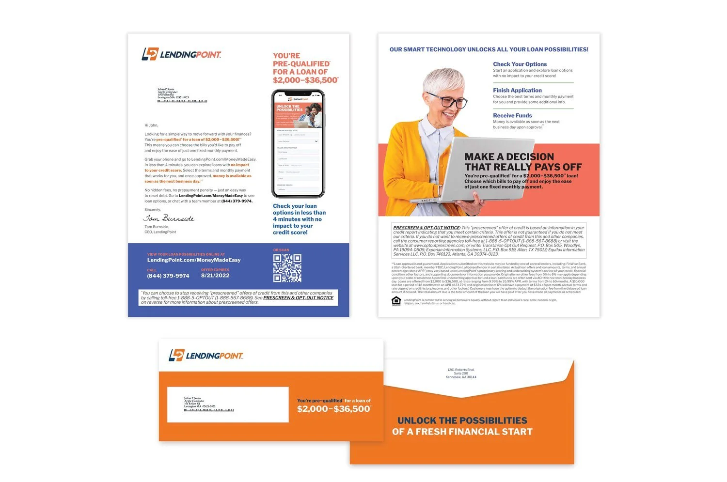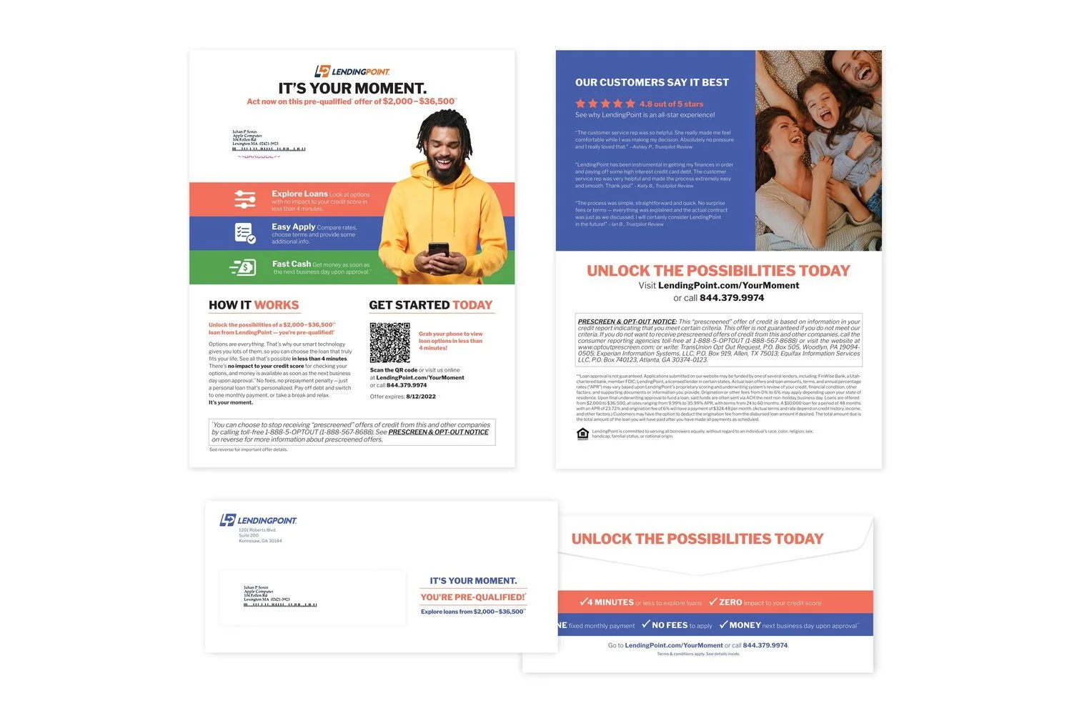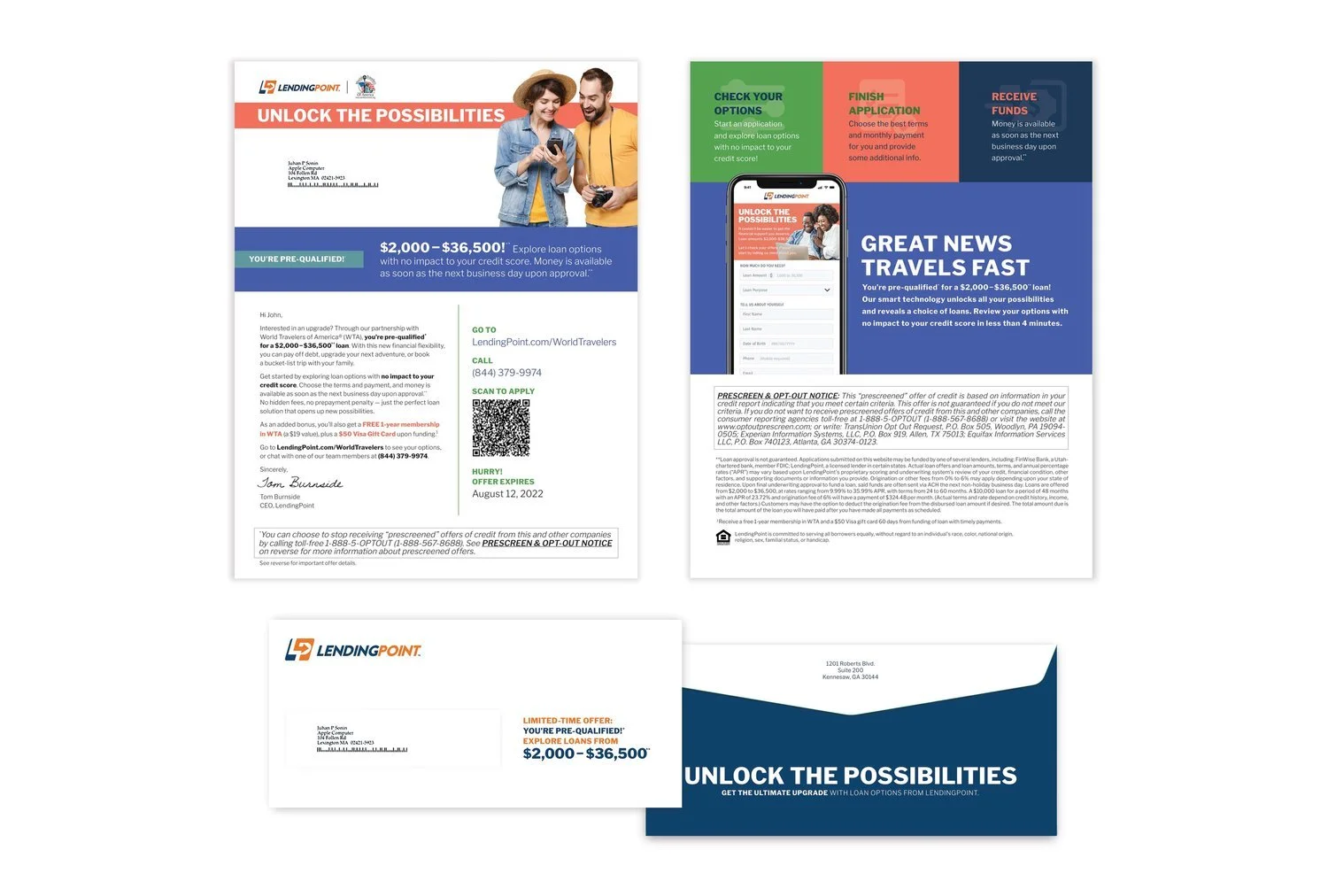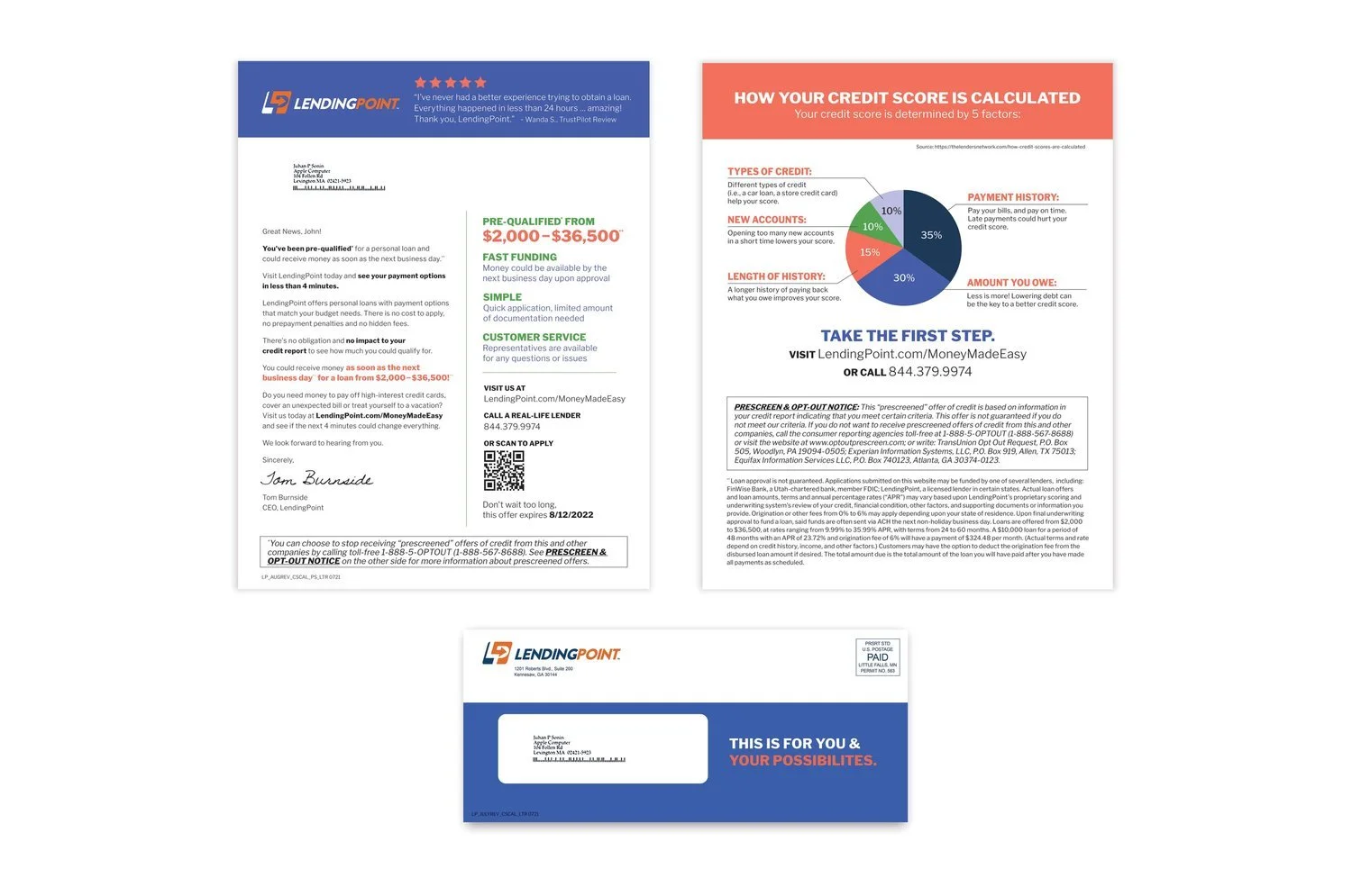Creative concept and direction for Lending Point. The challenge is to create a suite of direct mail pieces with different invitation-to-apply messages and designs to help lift application performance.